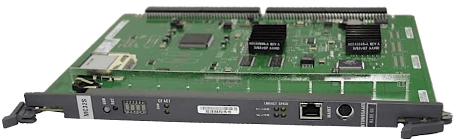The NTDW65 MC32S Media Card provides 32 IP-TDM gateway ports (DSP's). It replaces the previous ITG (Integrated IP Telephony Gateway Trunk) cards and runs on CS 1000 Release 5.0 software. The four-character LED faceplate display indicates card status or a fault condition.